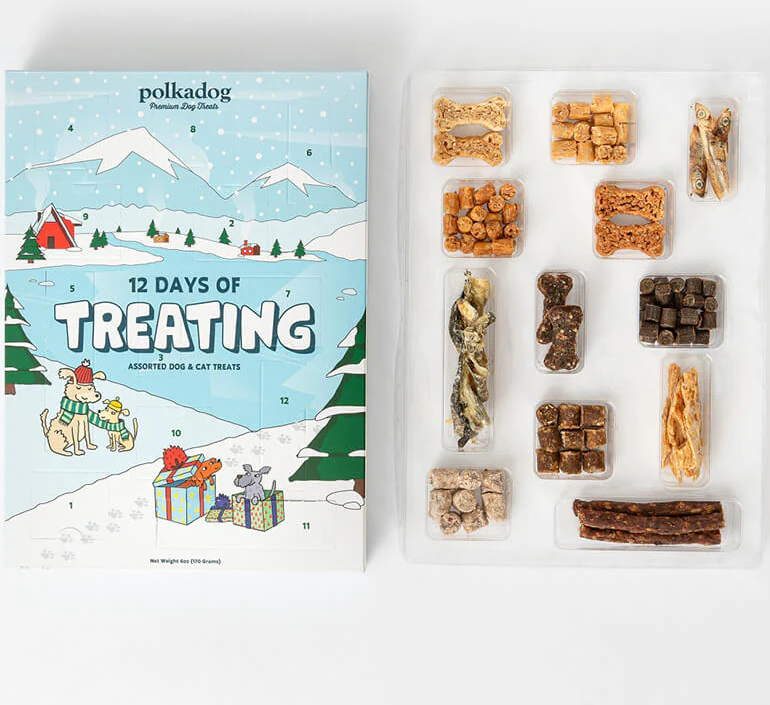 Keep your pups treats a surprise to you and your playful pup for the 12 days of Christmas with the Polka Dog Bakery Holiday Dog Treats - 12 Days of Treating Calendar!