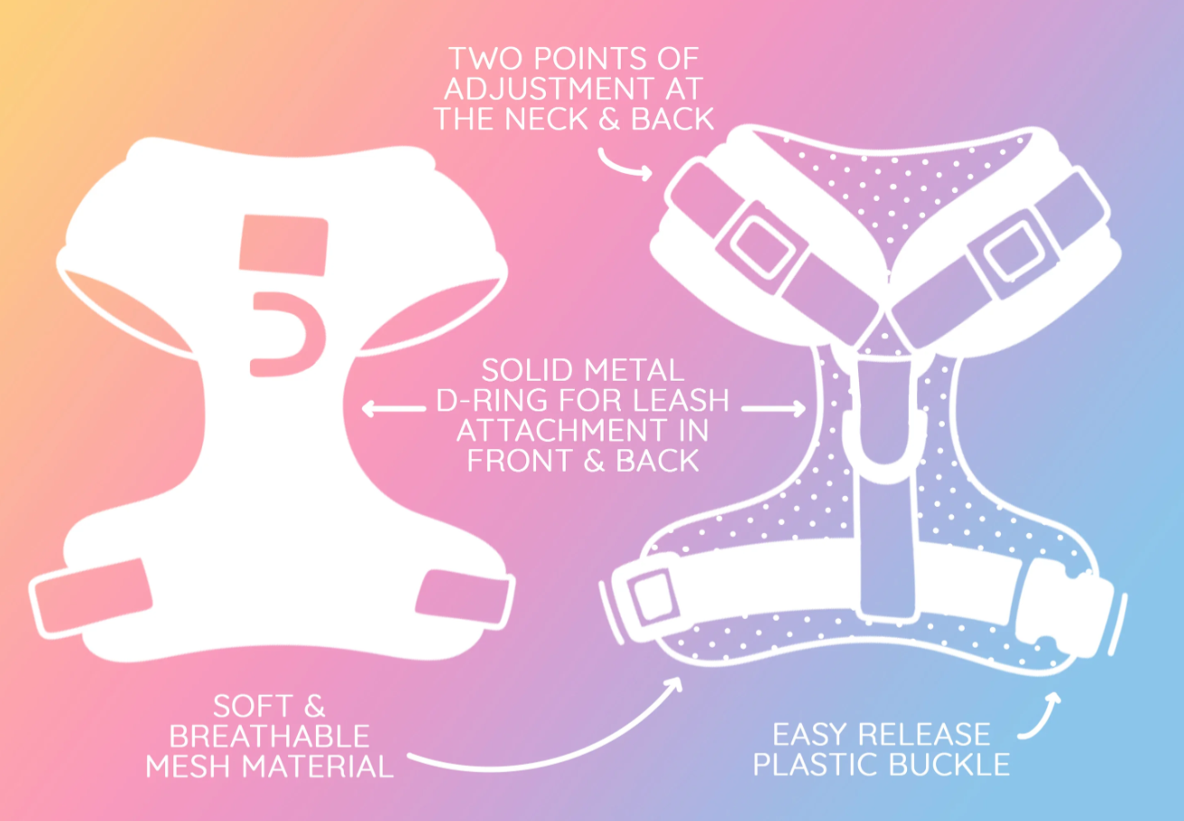 - Pair this harness with their matching collar, leash, waste bag holder!