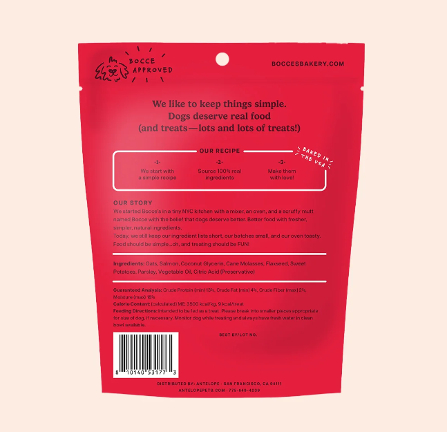 Ingredients: Oats, Salmon, Coconut Glycerin, Cane Molasses, Flaxseed, Sweet Potatoes, Parsley, Vegetable Oil, Citric Acid (Preservative)