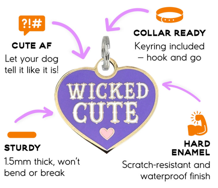 For the pups who are equal parts spooky and sweet, the “Wicked Cute” enamel tag is the ultimate Halloween accessory.